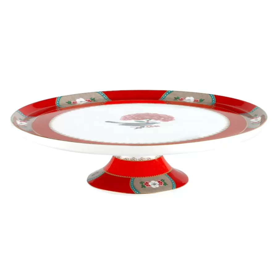 Um prato para bolo e prato de doces com 3 níveis de porcelana no tom rubro complementam a linha Blushng Birds. Além de organizar a mesa posta para aniversários e dias festivos, se tornam parte da decoração.